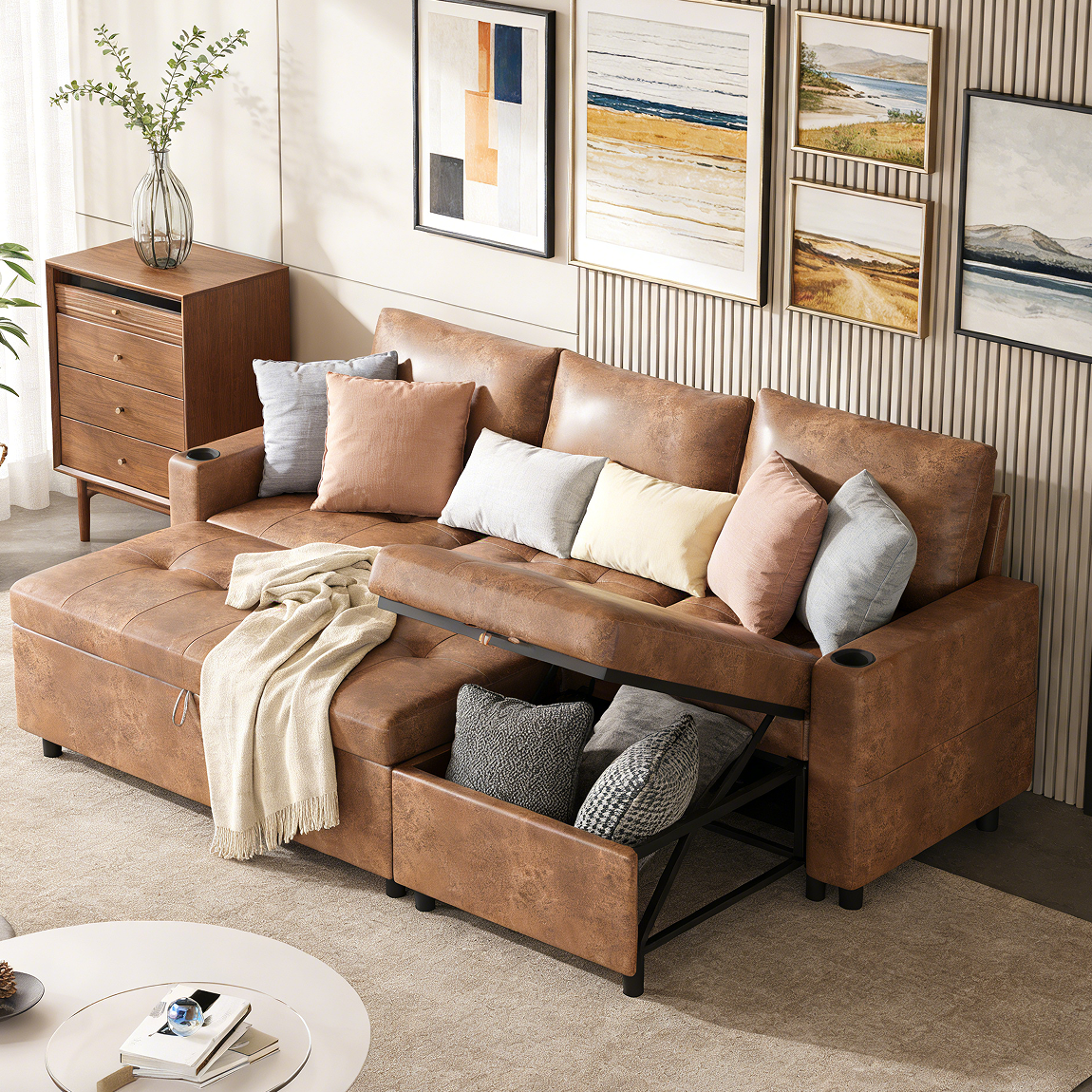 YODOLLA Faux Leather L-Shaped Sleeper Sofa, Pullout Bed, USB & Storage, Brown