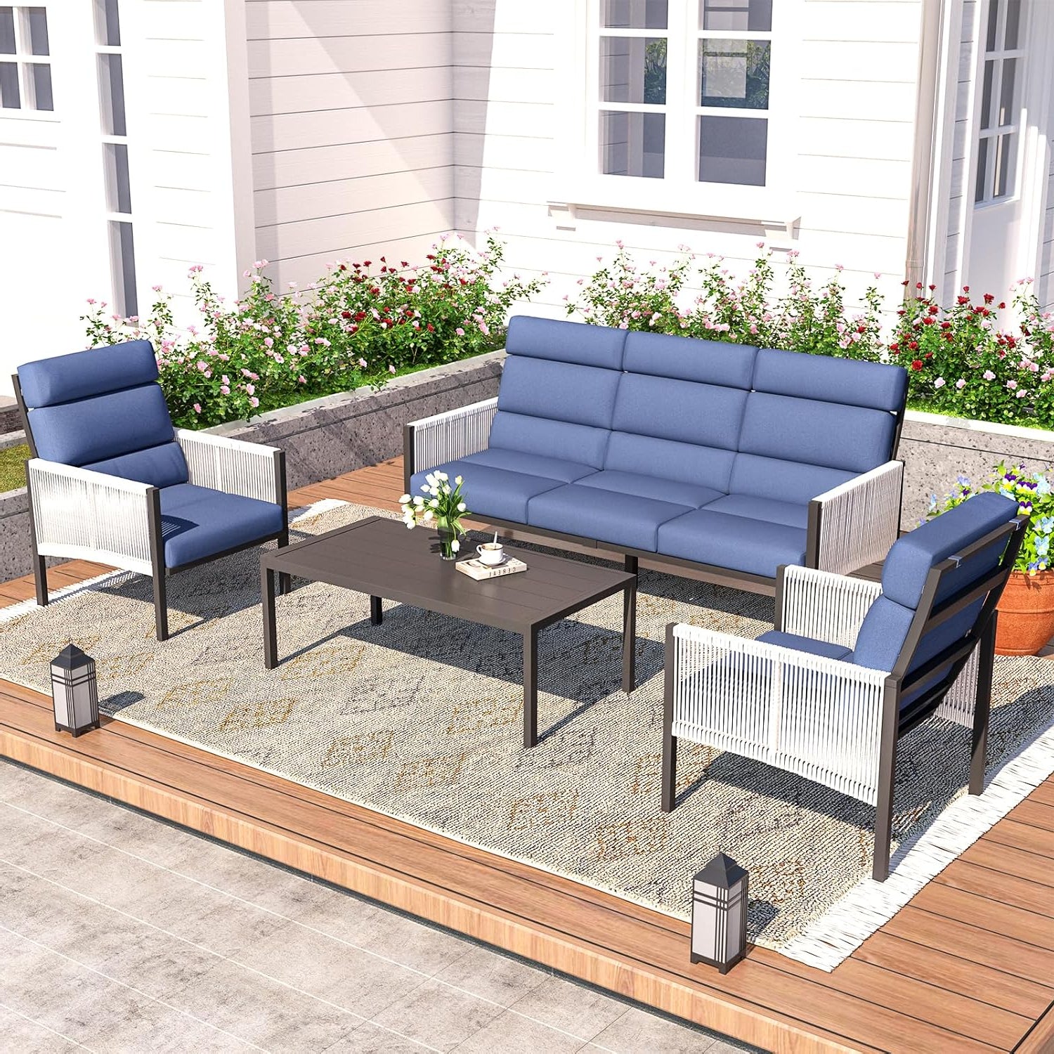 YODOLLA 4 Pieces Aluminum Patio Furniture Set with PE Rope Armrest, Dark Blue