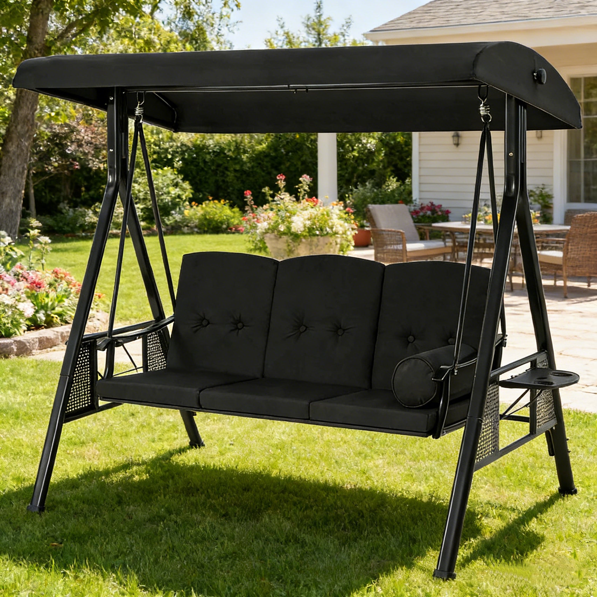 Yes, the adjustable canopy lets you tilt the shade to block direct sunlight—making this black patio swing both functional and stylish for various weather conditions.