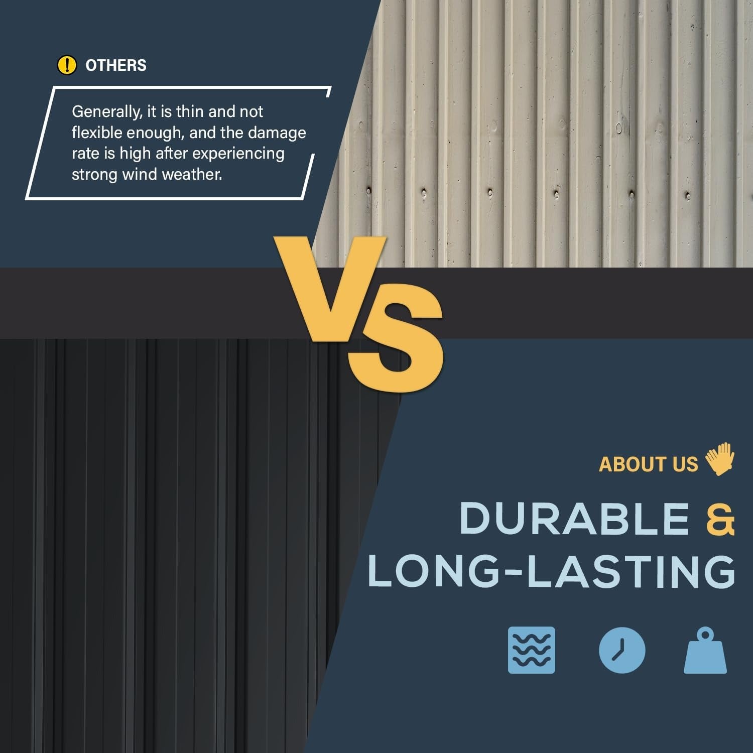 The YODOLLA 10x14 Metal Outdoor Storage Garden Shed in dark gray offers a perfect solution for those seeking large sheds. With expansive square footage, this 10x14 shed easily accommodates various outdoor vehicles, tools, and even functions as a dedicated outdoor workspace or luxurious pet suite. Whether you're looking for a large outdoor shed to store recreational equipment or a garden tool shed for your gardening supplies, this shed provides the space you need. Designed with reinforced metal plates, it is highly stable and more durable than cheaper alternatives. Built to withstand extreme weather, it offers exceptional wind resistance of up to 70 mph, making it a reliable backyard storage shed. The galvanized coating ensures protection against rust, oxidation, and moisture, keeping your stored items secure year-round. With sleek black shed aesthetics, it not only provides functionality but also adds style to your outdoor space. Our customer-friendly support team is always ready to assist you with any concerns.FAQ