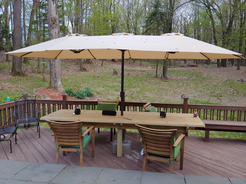 A: This heavy duty patio umbrella features a rust-free, powder-coated steel pole and 12 reinforced ribs, providing excellent stability. However, it is still recommended to close the umbrella during strong winds or storms to prevent damage.