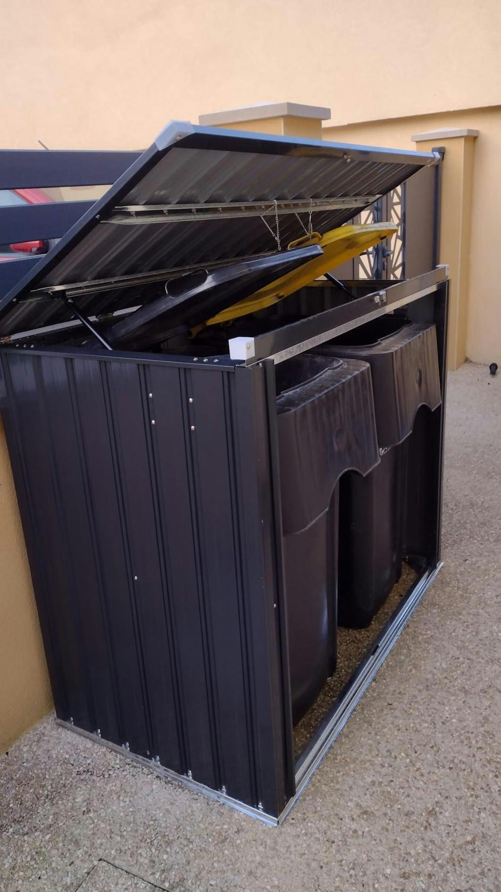 A: Unlike basic storage units, this trash can shed includes locking double doors and reinforced steel construction that deters pests and unauthorized access. The 72-pound weight provides stability while the upward-opening lid hooks allow partial access without fully exposing contents.