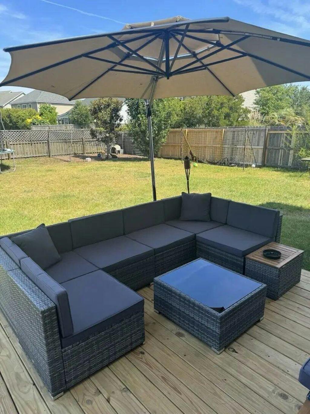 YODOLLA 7-Piece Outdoor Patio Furniture Set — weather-resistant rattan seating with grey & navy cushions, ideal for patios, decks, gardens, or backyard lounging.