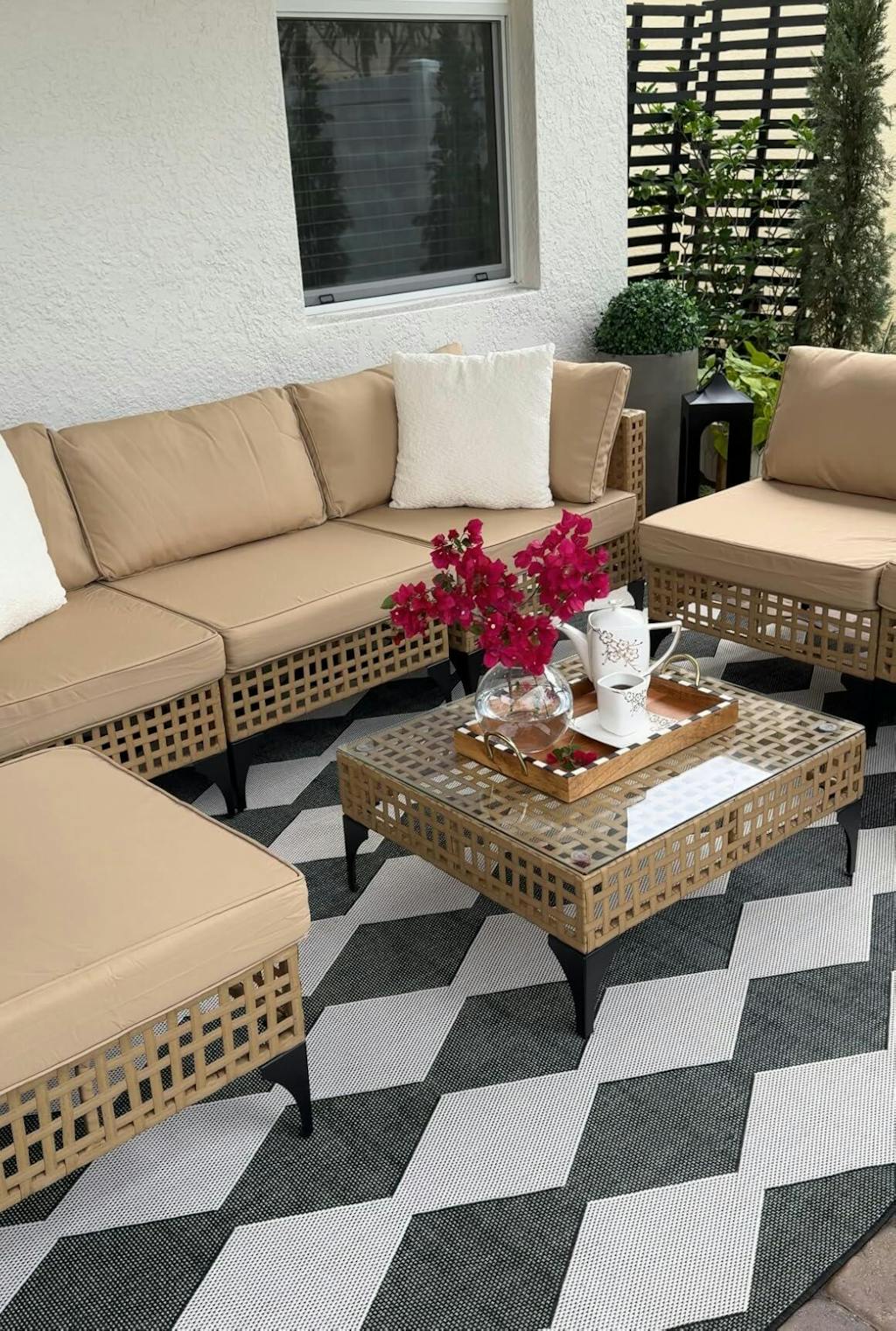 YODOLLA 7-Piece Outdoor Sofa Set, Beige Rattan & Cushions features a stylish boho design with minimalist lines and tapered metal legs, giving the patio sectional sofa a modern, elegant look. The modular set includes 2 corner chairs, 4 armless chairs, and a glass-top tea table, allowing flexible arrangements. Made with durable all-weather resin wicker and powder-coated steel frames, this u shaped patio furniture withstands outdoor elements with ease. The 3.6-inch thick cushions have fade-resistant, removable, machine-washable covers for easy care. Perfect for both indoor and outdoor use, this rattan dining set combines comfort and style, making it one of the most comfortable outdoor sectionals and a great addition to any contemporary outdoor dining set.