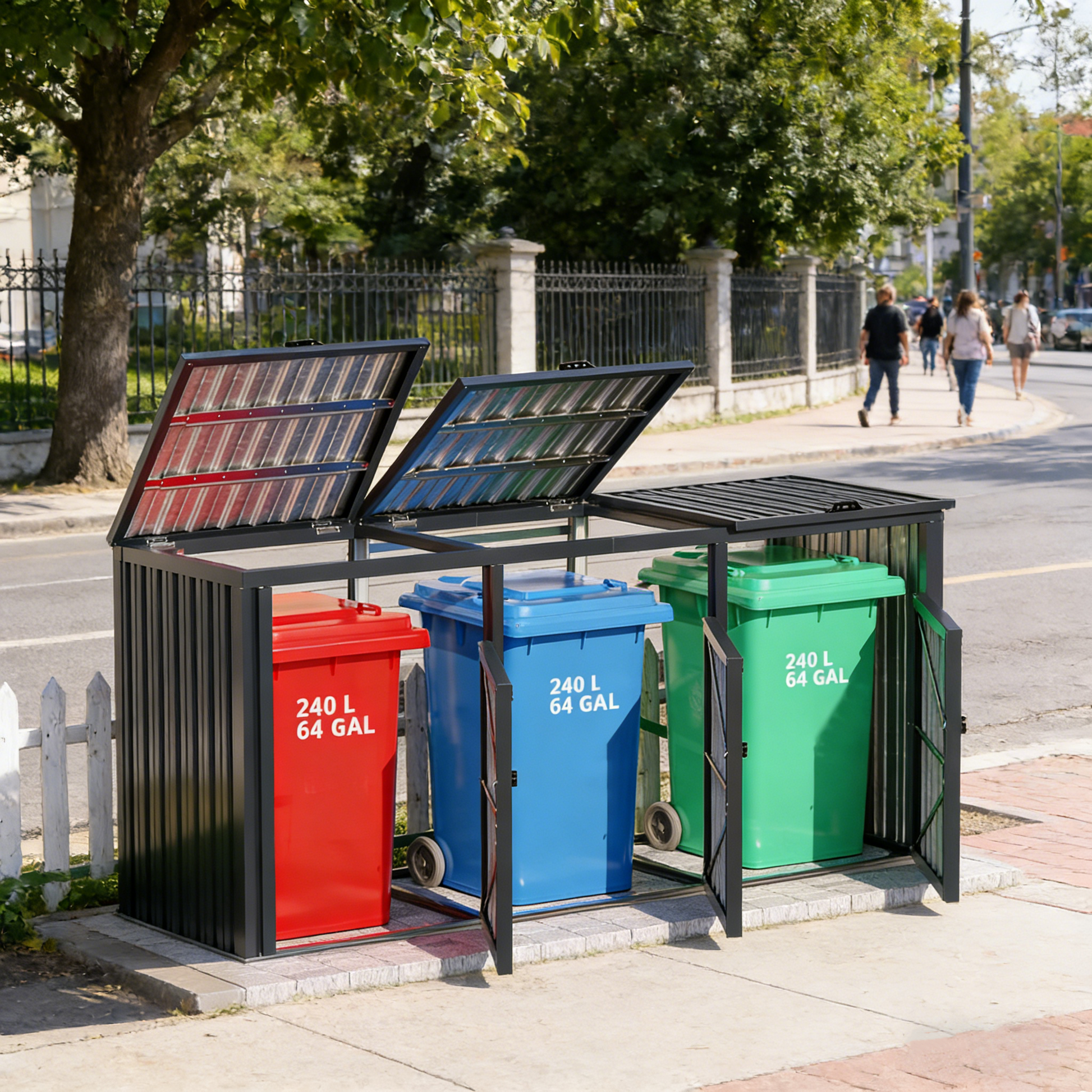 This Outdoor Trash Can Storage Shed is designed to keep up to three garbage cans neatly concealed while enhancing the look of your outdoor space. With a generous 73 cu.ft capacity, it easily accommodates standard trash, recycling, and yard waste bins. The durable, waterproof construction protects contents from rain, wind, and harsh weather, while the dark grey finish offers a clean, modern appearance that blends well with patios, gardens, and driveways. Its horizontal cabinet design allows easy access and smooth opening for daily use. Ideal for outdoor storage clearance needs, this shed helps keep your area organized, tidy, and visually appealing.