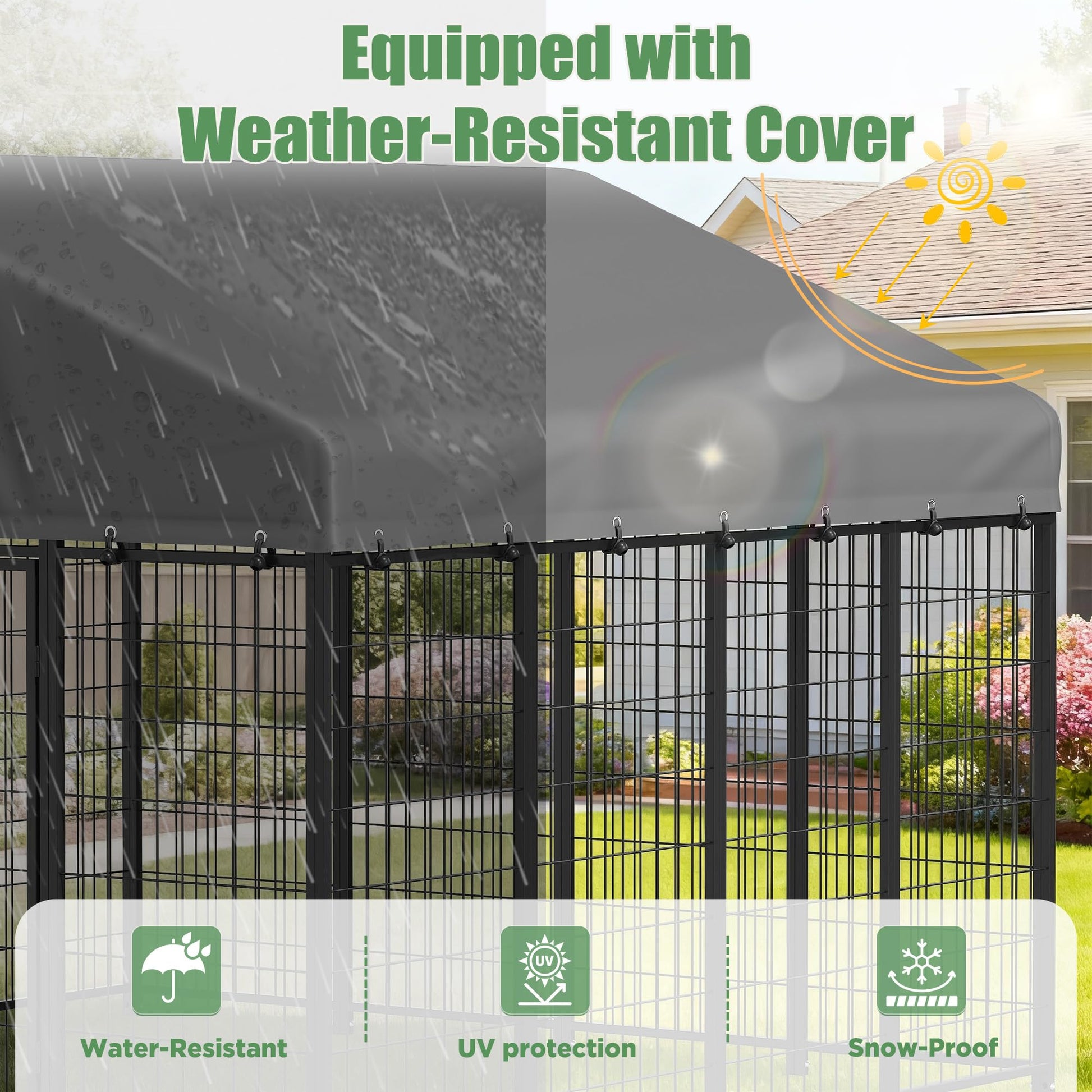 • Weather-Resistant Cover: This outdoor kennel is equipped with a waterproof tarp, providing excellent protection from sun, rain, and snow, ensuring your pets stay safe and comfortable in all weather conditions
