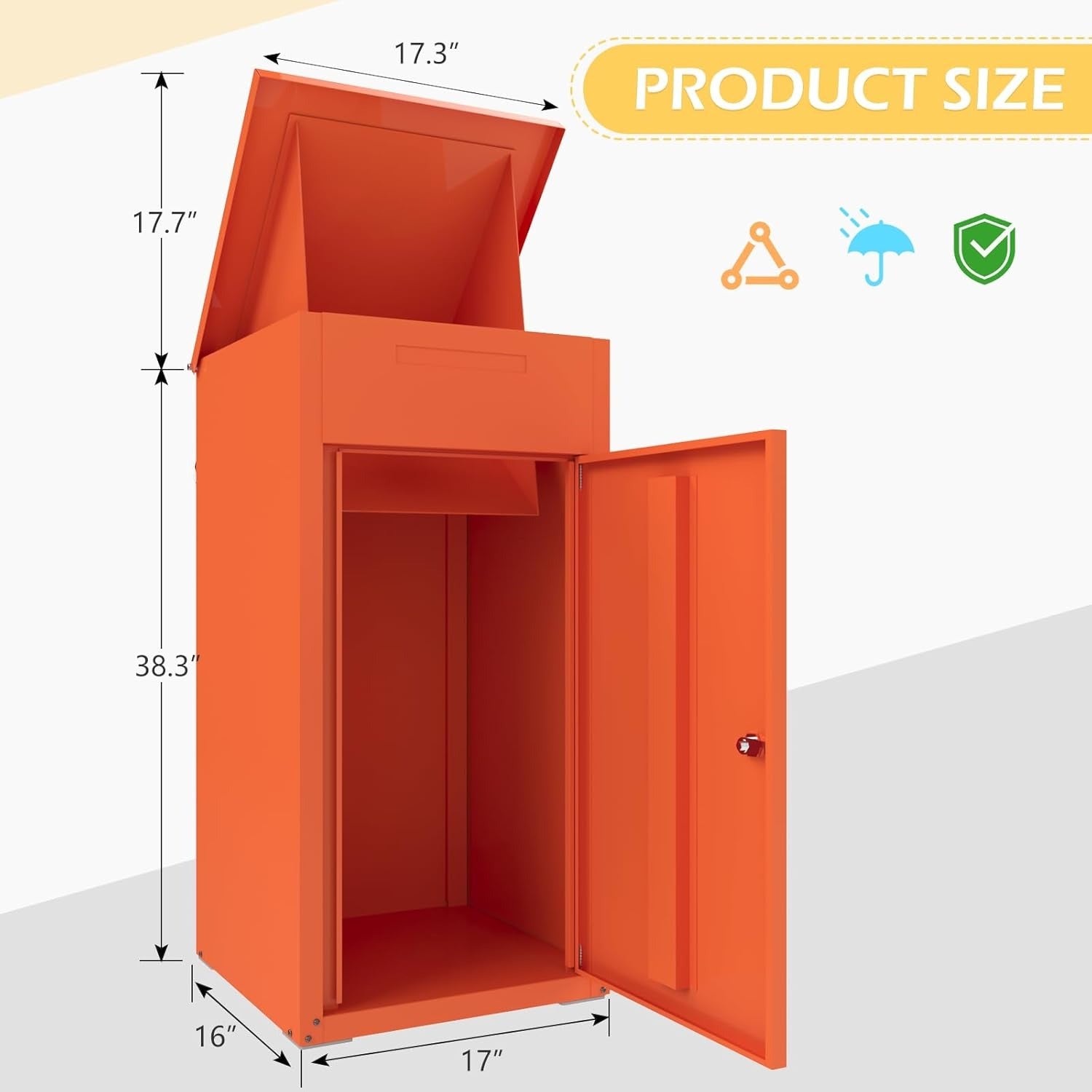 • 【Large Capacity 】: our package delivery box is designed with large capacity which combined by a parcel drop and a mail box.The dimension of the frame is 17" x 16" x 38.3" which is suffucient for small, standard and large parcels. While the letter delivery port is perfect for bills, notices, and other documents.