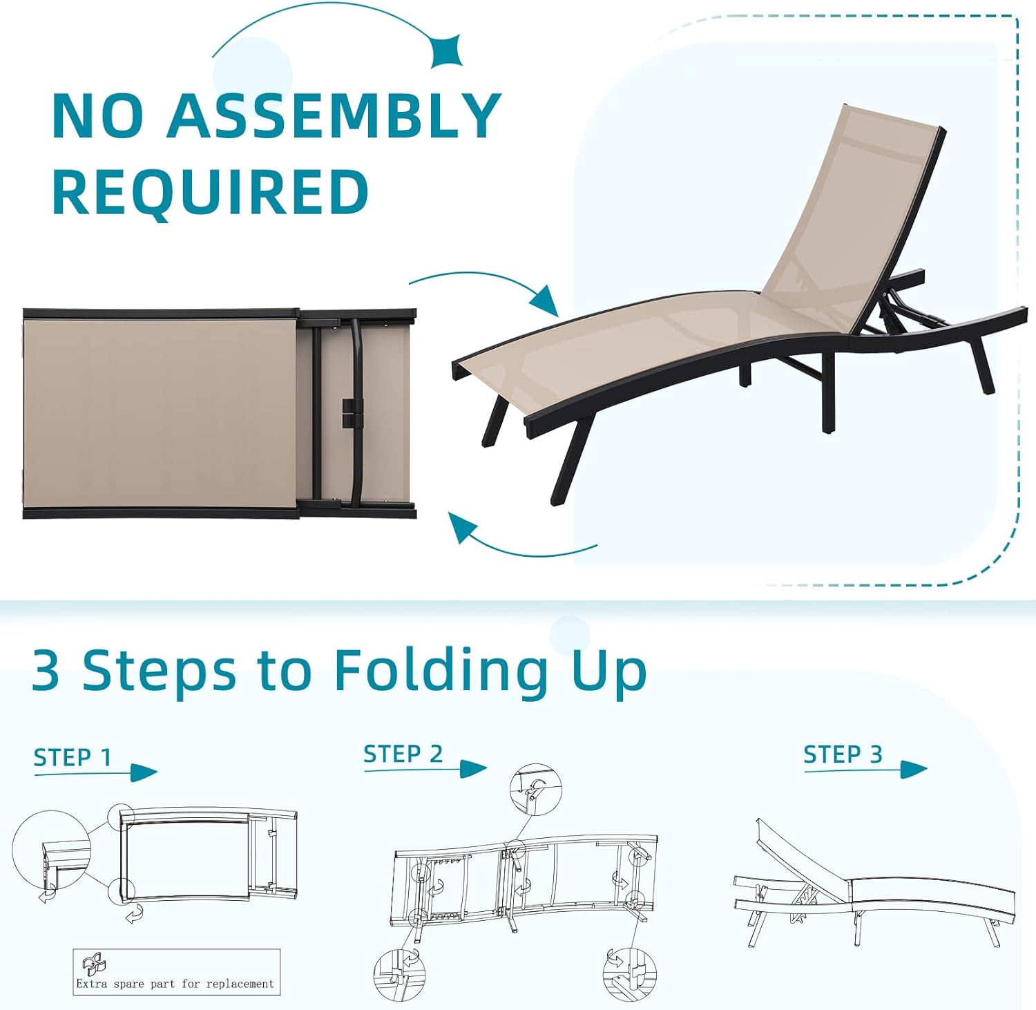 No assembly is needed. This folding chaise lounge comes fully assembled and ready to use straight out of the box—just unfold it and start relaxing.