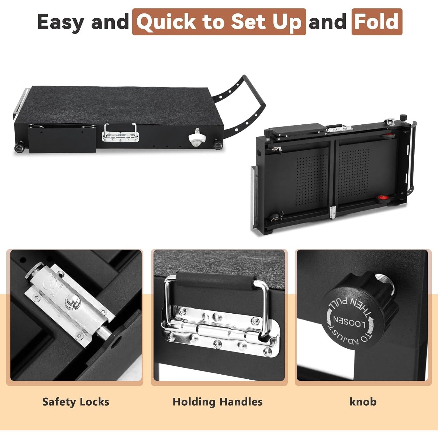 【Upgraded Design】Compared with other outdoor foldable grill tables, we made improvement in its designs for better using experience, we design one rack in front and add another in side, besides, we attch 5 hooks for hanging barbecue or kitchen utensils; the left side also has a tool holder especailly for knifes, it added a bottle opener. It has a heat resistant mat for protecting the table.