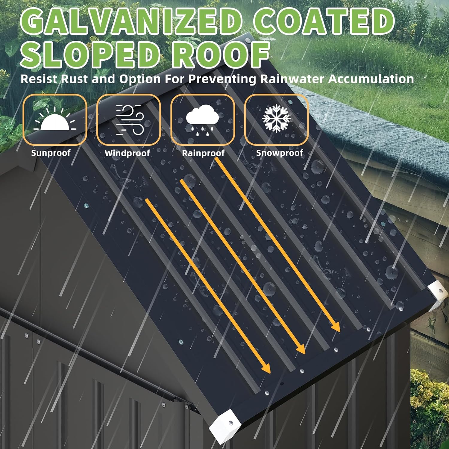• Weather Proof Outdoor Shed: The garden storage tool shed features a sloping roof to prevent water pooling and an elevated floor to avoid water ingress, ensuring dry and safe storage